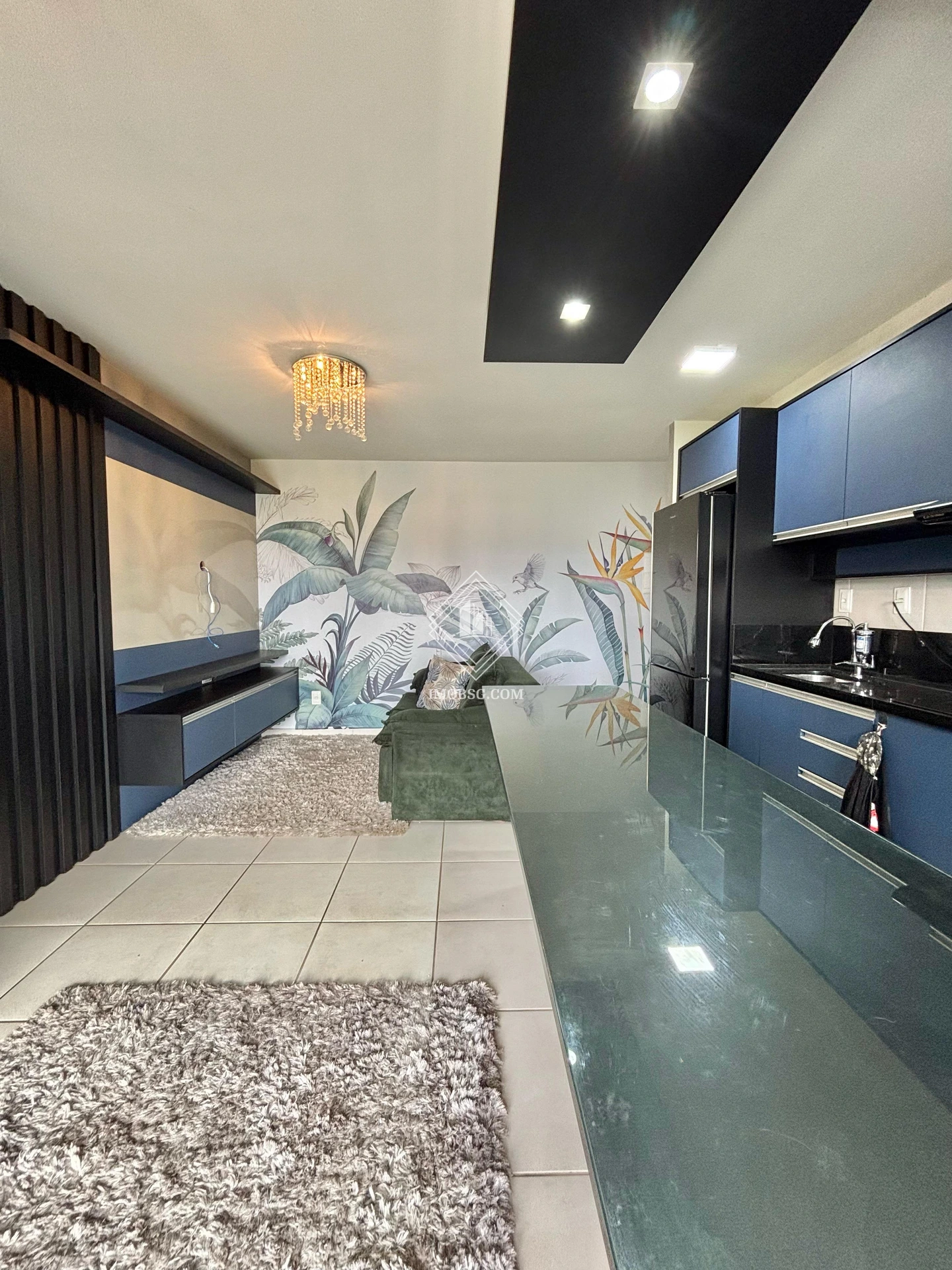 - Sala de estar com sofá, painel para TV e tapete;