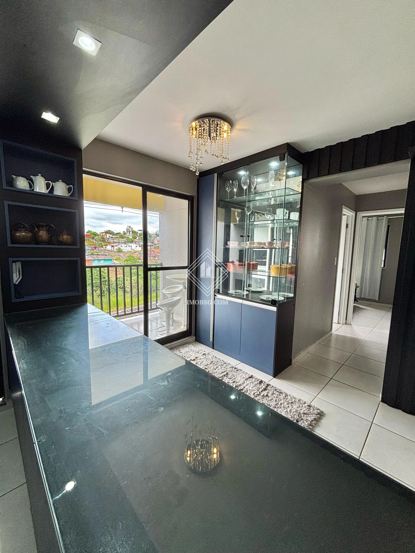 - Sala de jantar com cristaleira e utensílios e tapete;