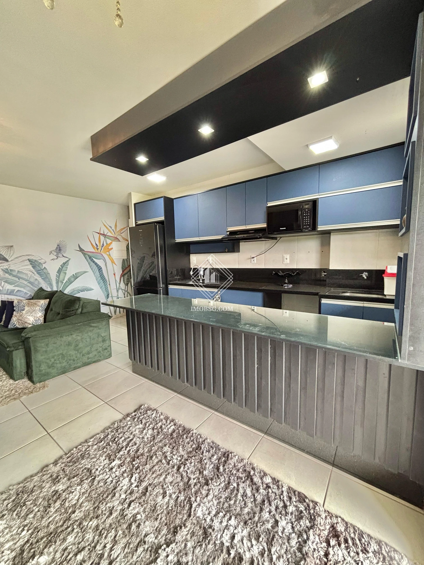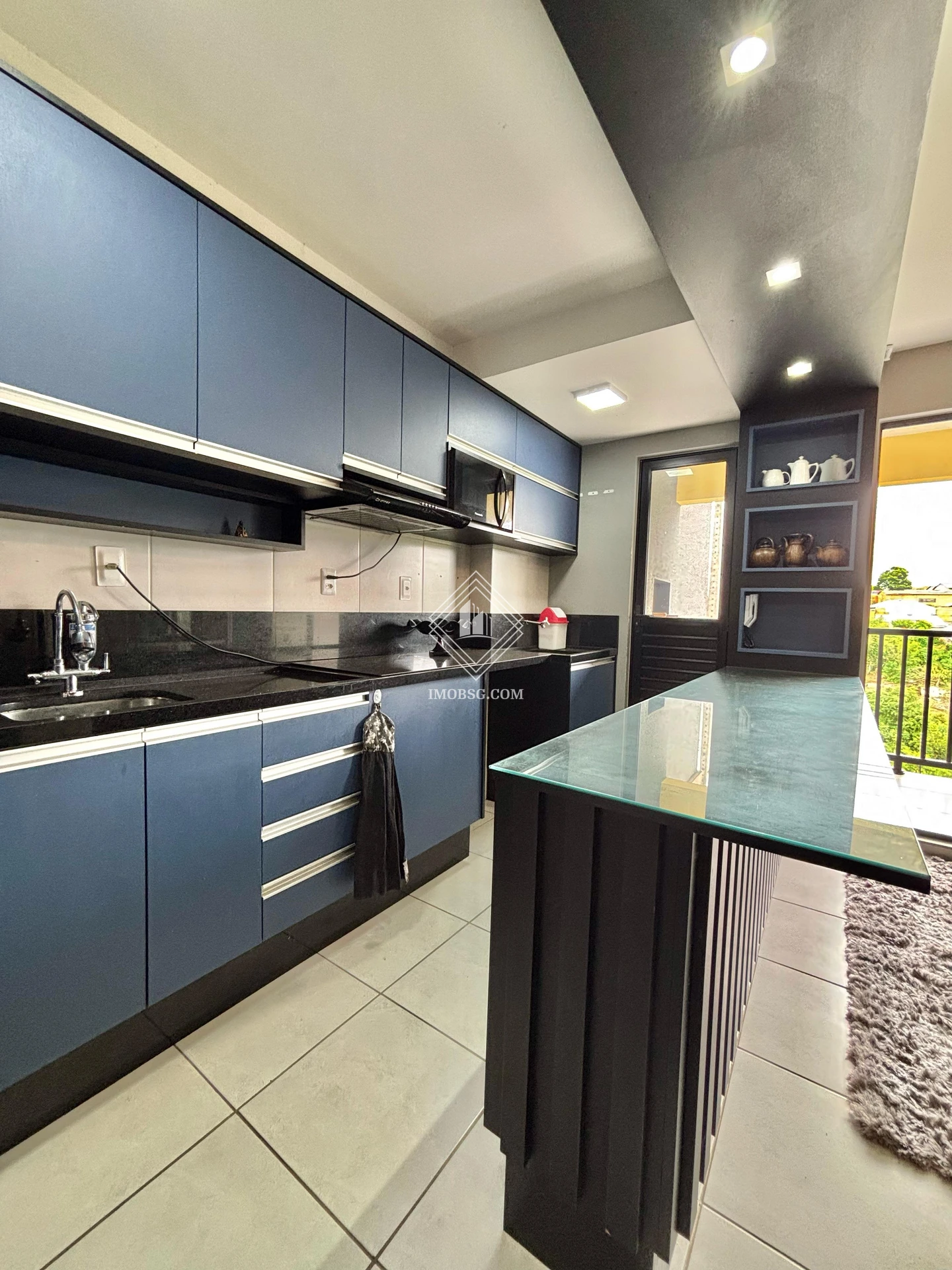 - Cozinha com armários planejados, geladeira, cooktop, depurador de ar e microondas;