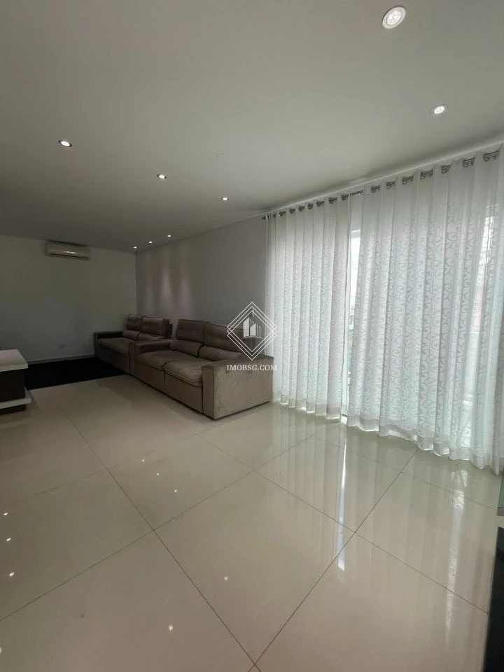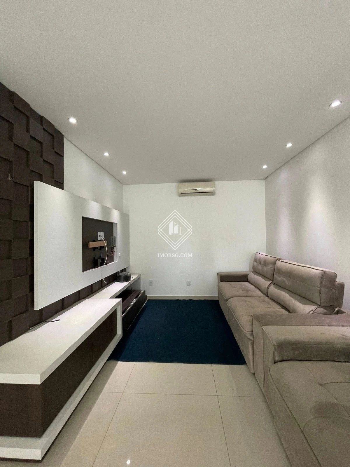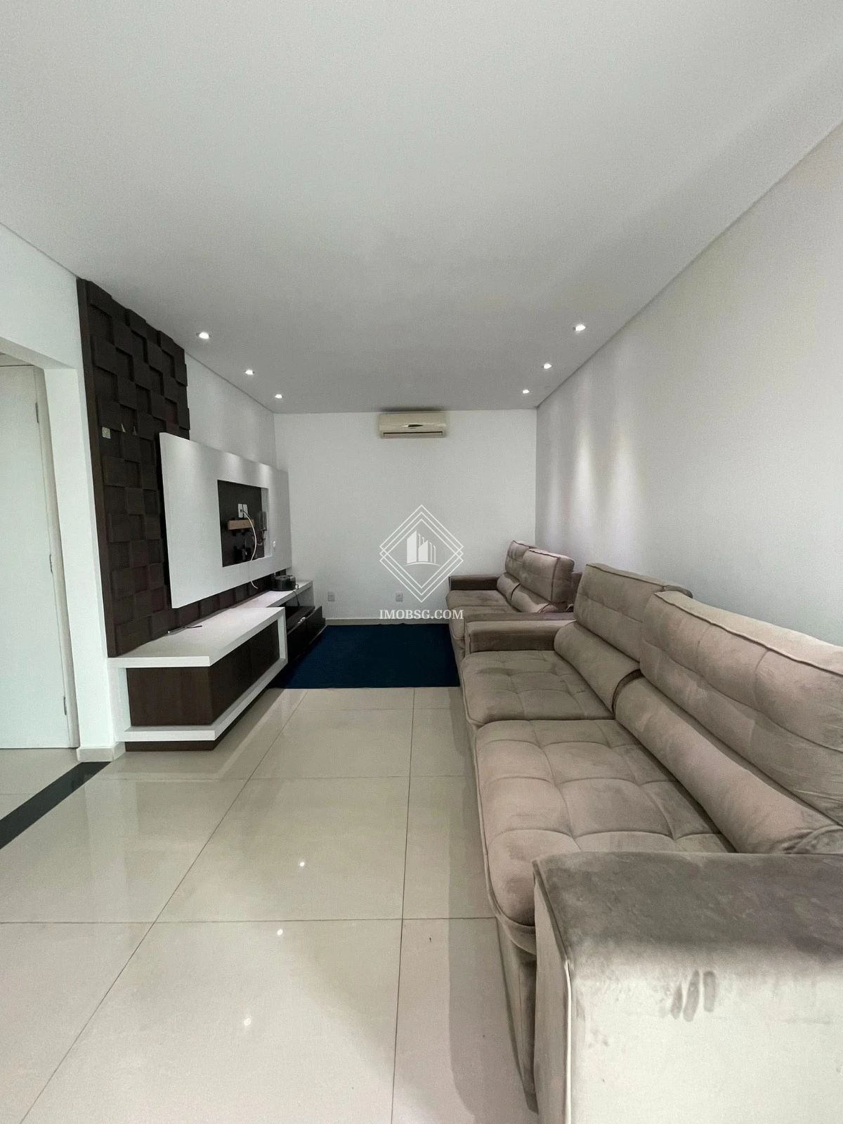 Sala ampla, arejada, com painel planejado e ar-condicionado