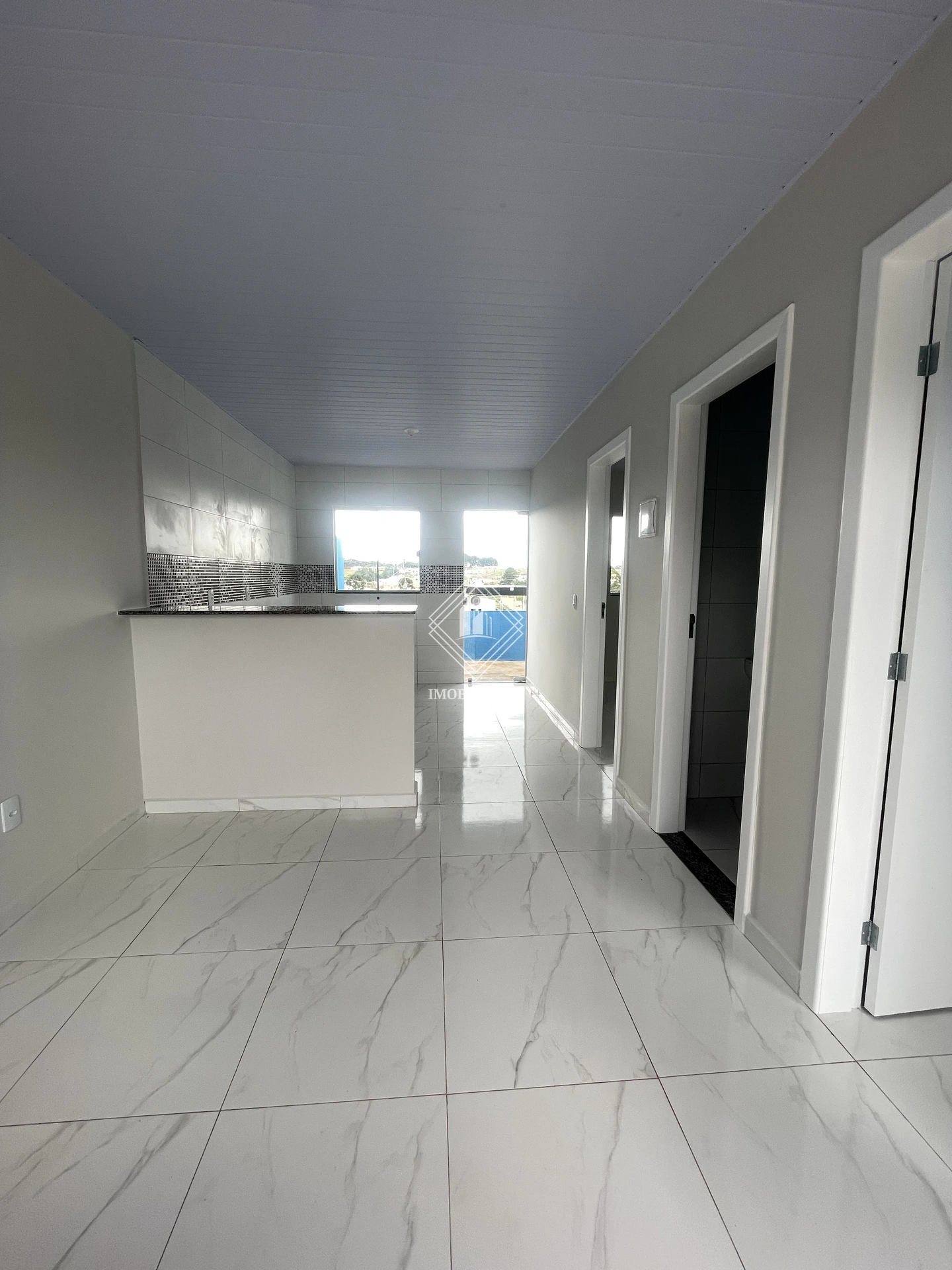 Sala e cozinha integradas e com bancada;