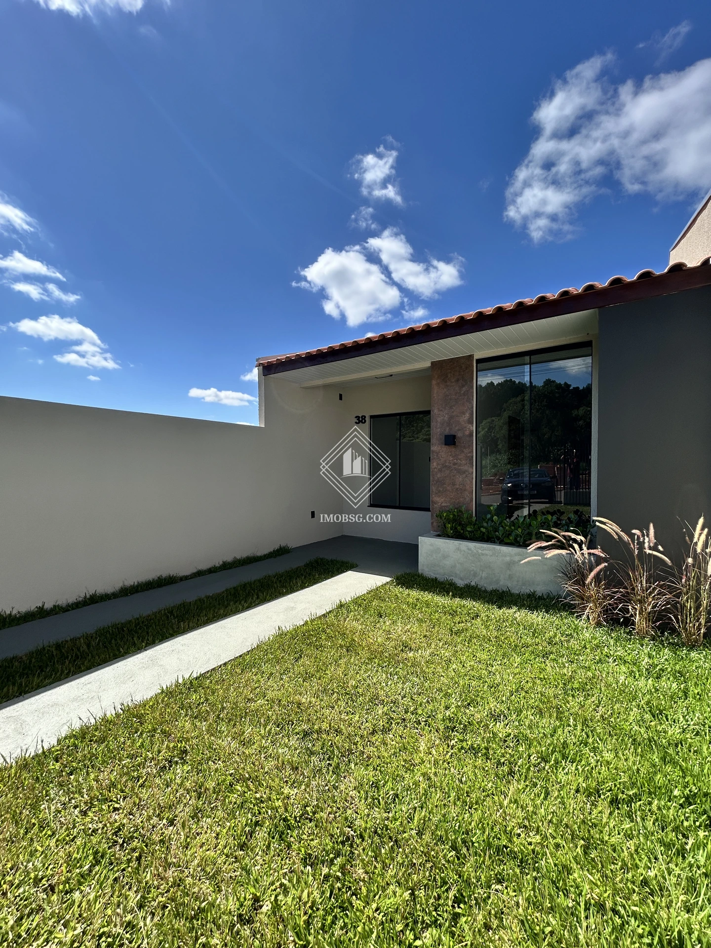 Fachada moderna com janelas amplas, revestimento e arandela, floreira e jardinagem de bom gosto e terreno nos fundos, o espaço propicia construir uma suíte, piscina ou área gourmet.