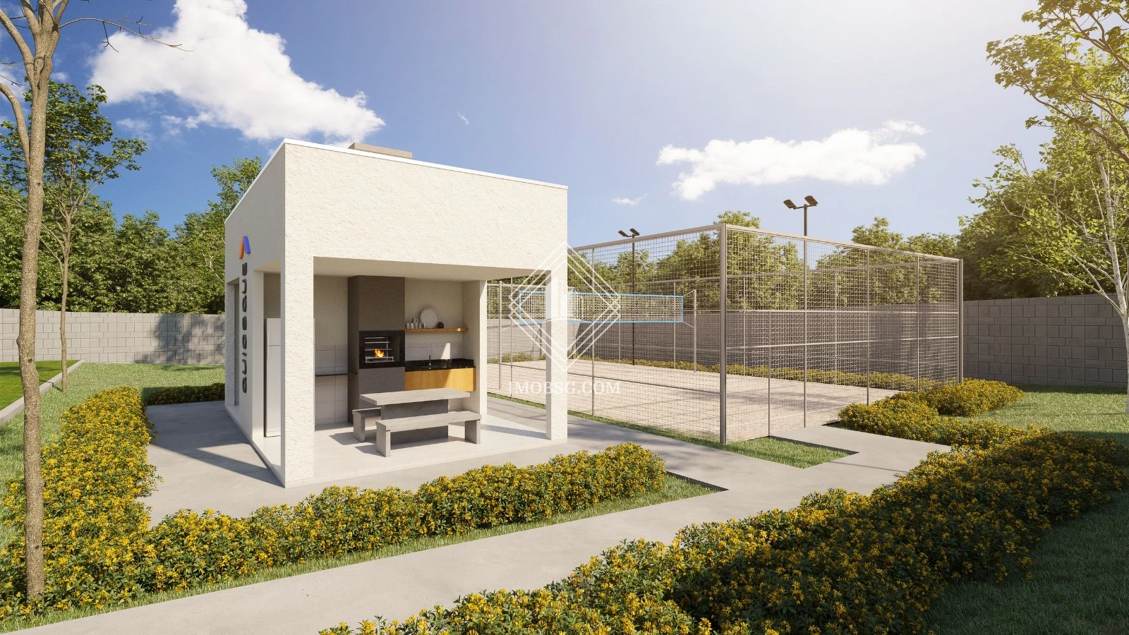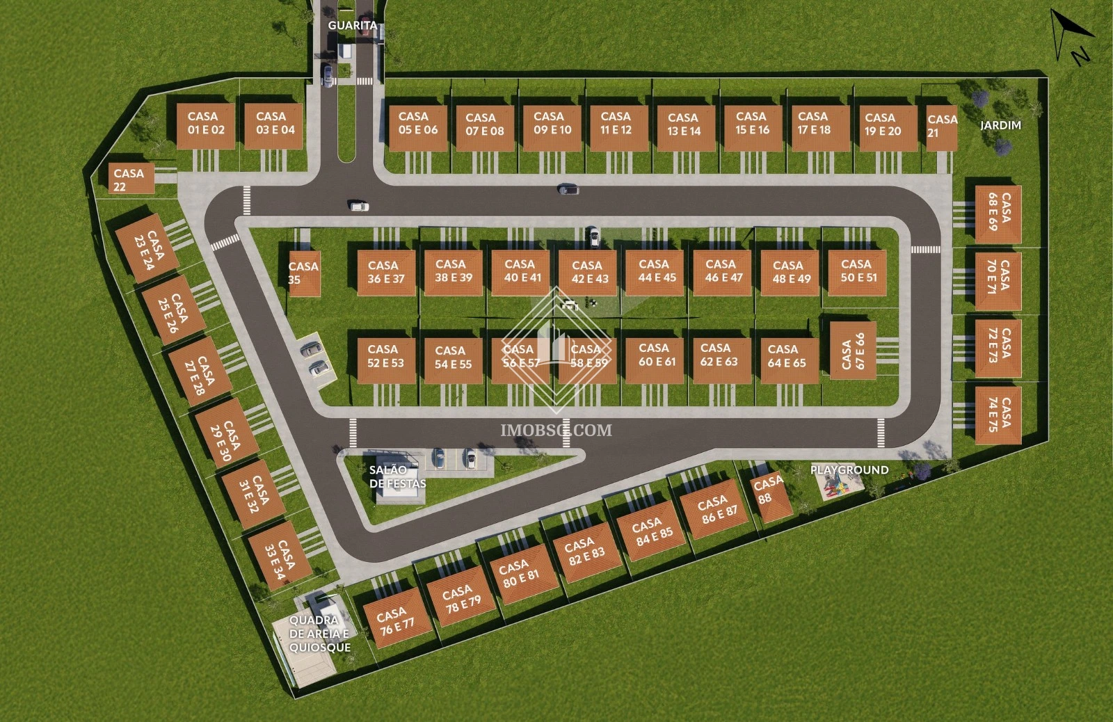 Condomínio fechado com ampla área de lazer: salão de festas, quiosque com churrasqueira, quadra de futebol de areia, playground, portaria.