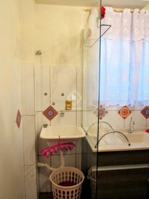 1 banheiro com armário e blindex