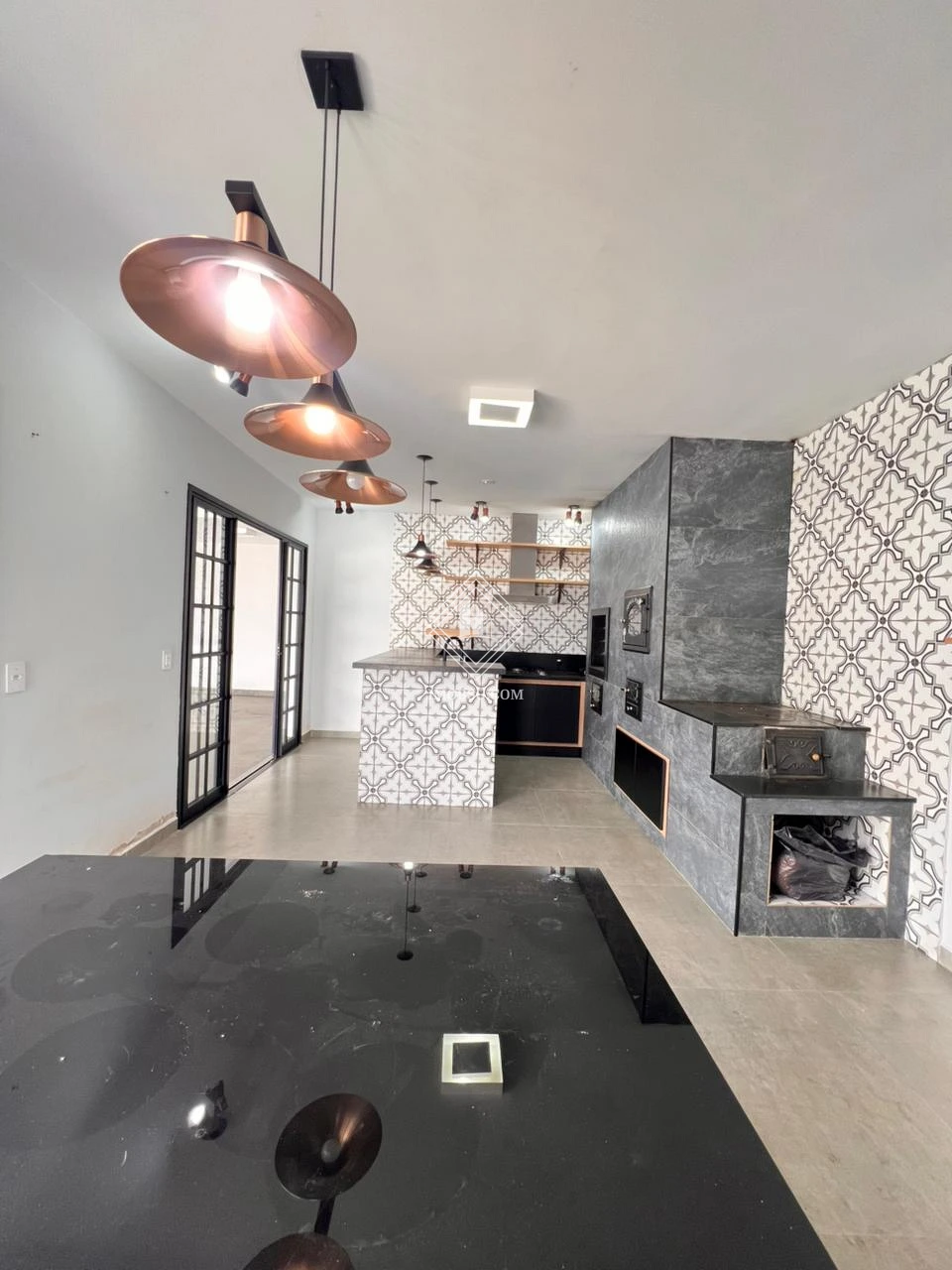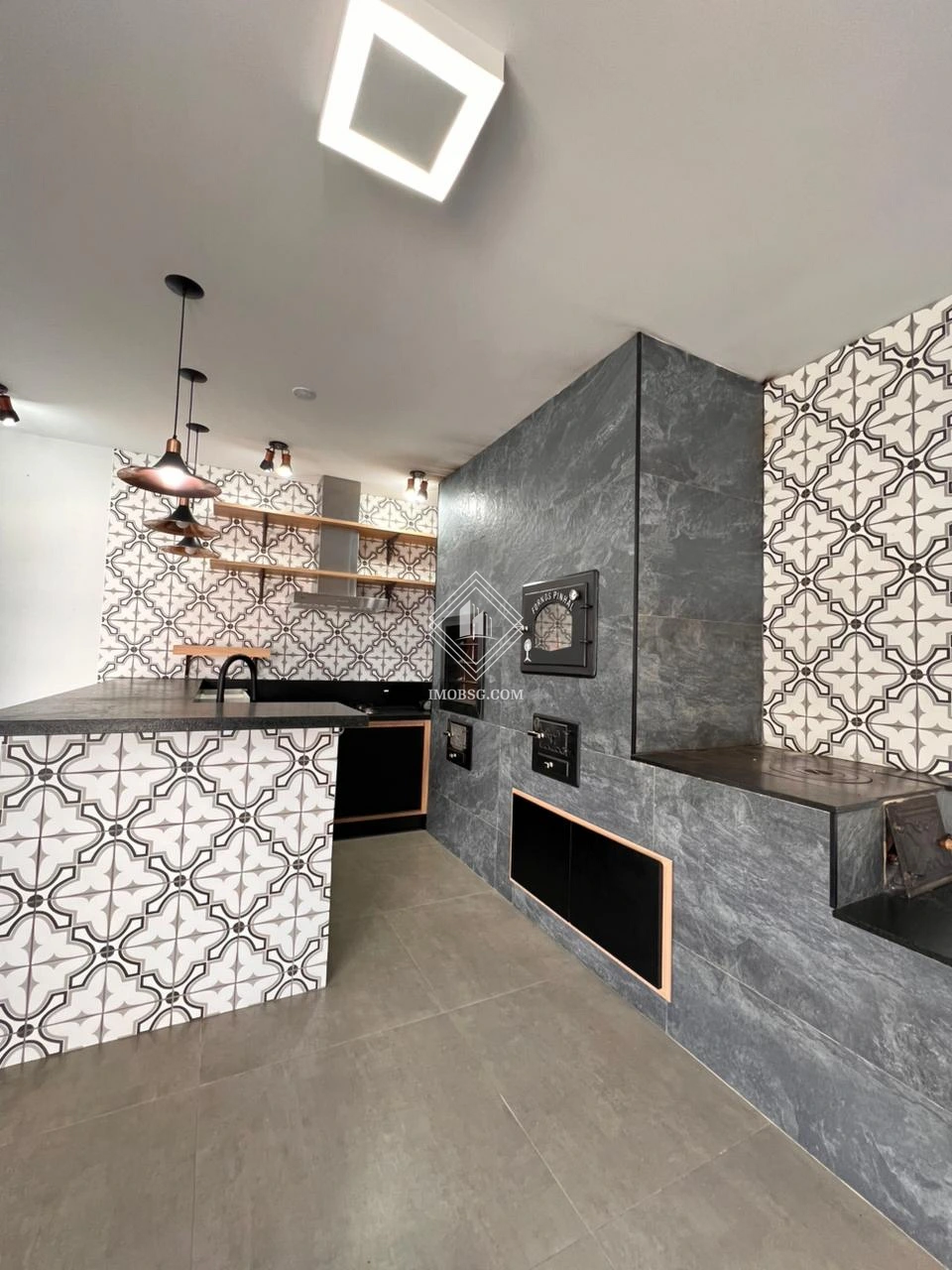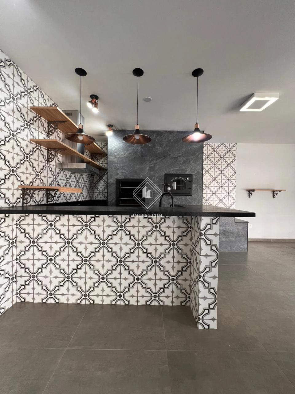 Área gourmet equipada com churrasqueira, fogão a lenha, mesa de jantar e bancada para 04 banquetas