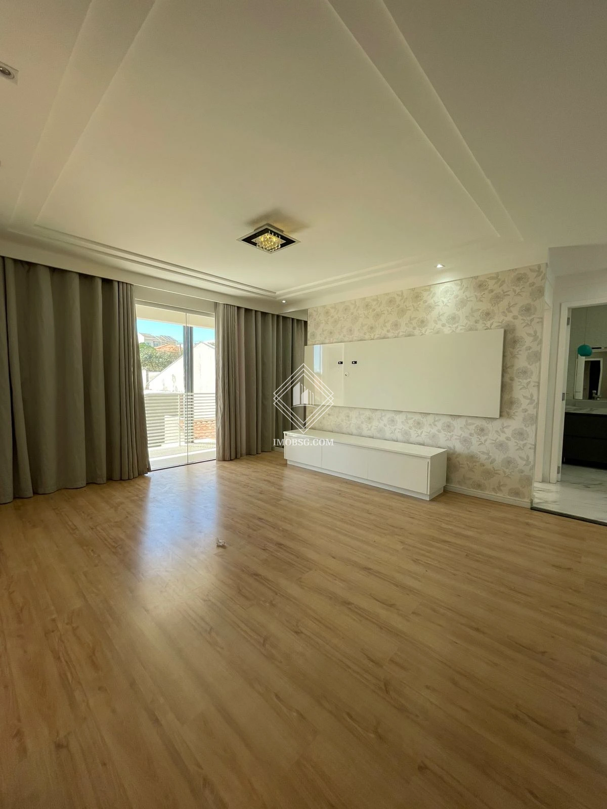 ✔ Sala íntima de TV com painel, bar e sacada