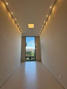 Sala ampla com pé direito alto, gesso rebaixado e iluminação em LED